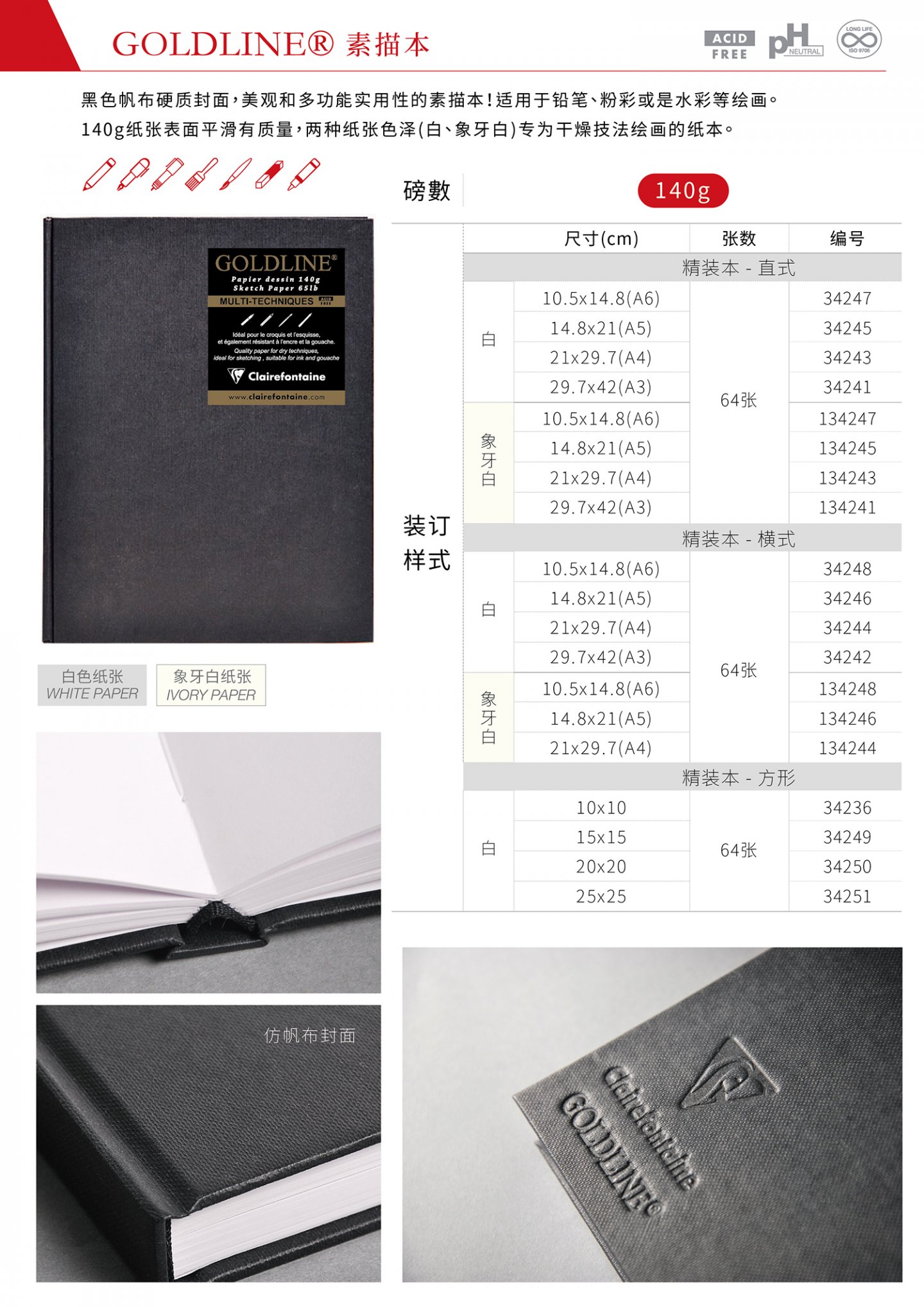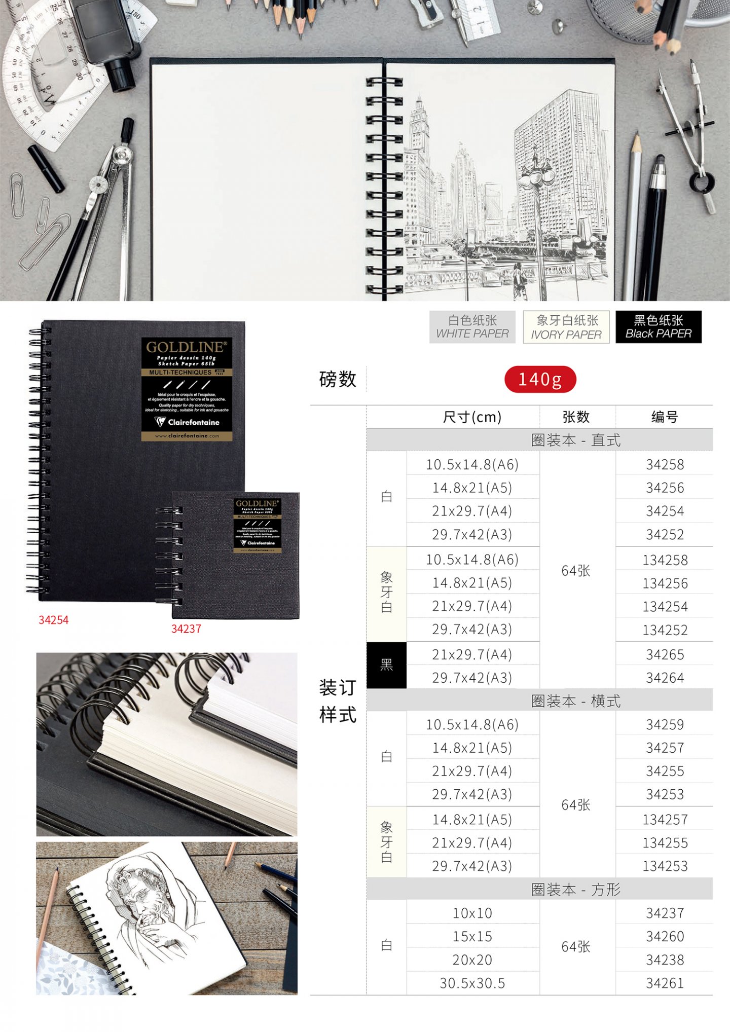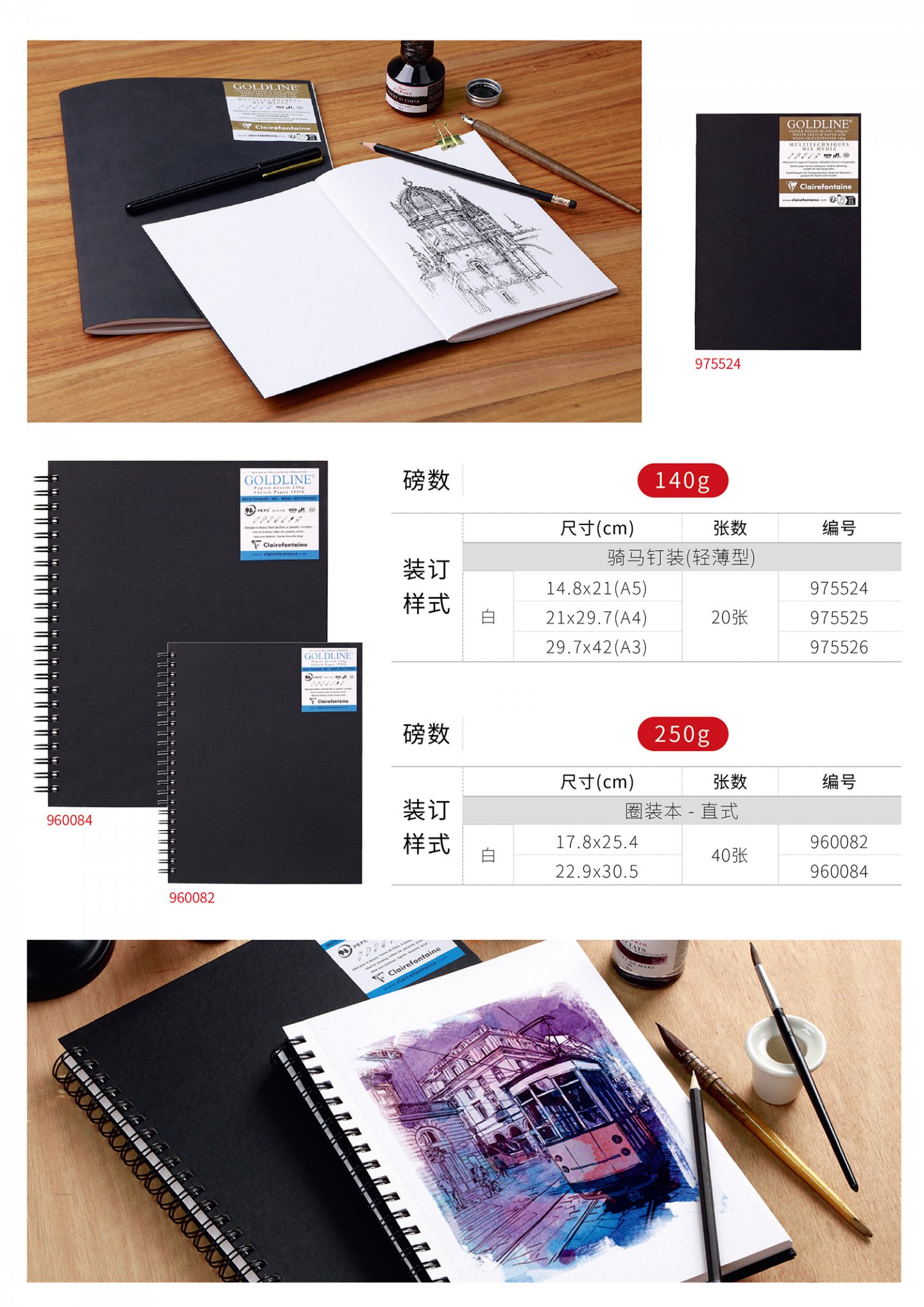商品说明: 专为干燥技法绘画的纸本,适用铅笔、代针笔、彩色墨水、水彩(不适合用水洗技法)。 轻薄型速写本(140g):以骑马钉装订140g的轻薄型速写本,方便携带,用于随身携带写生。 硬封皮速写本(250g):250g较厚纸质速写本,圈装装订好翻阅。 > >