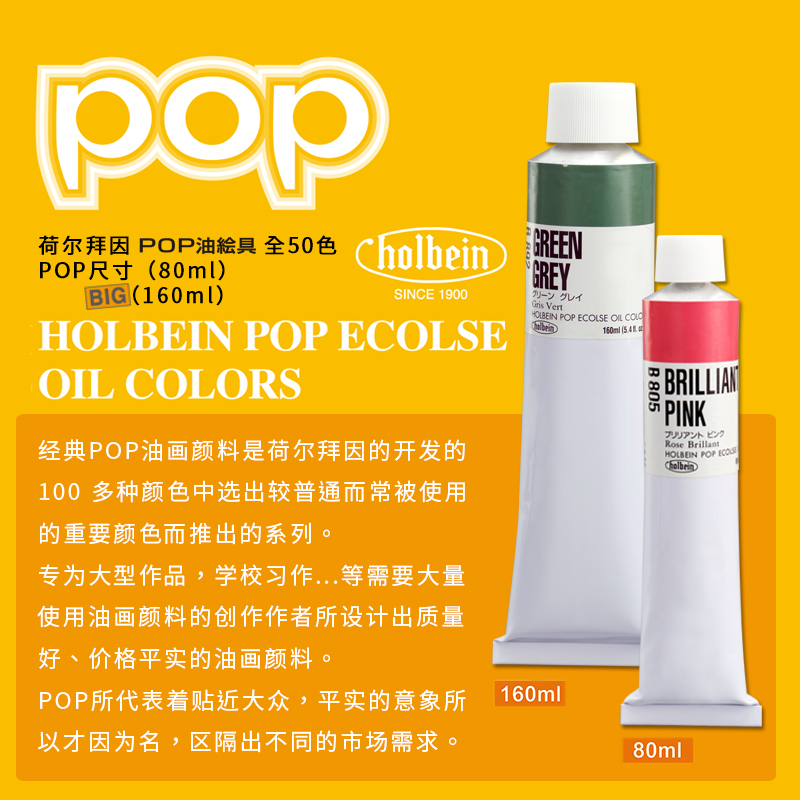 荷尔拜因针对时常需要许多油画颜料的创作者,推出容量充足、共50色不分等级、价格平实的经典POP油画颜料。