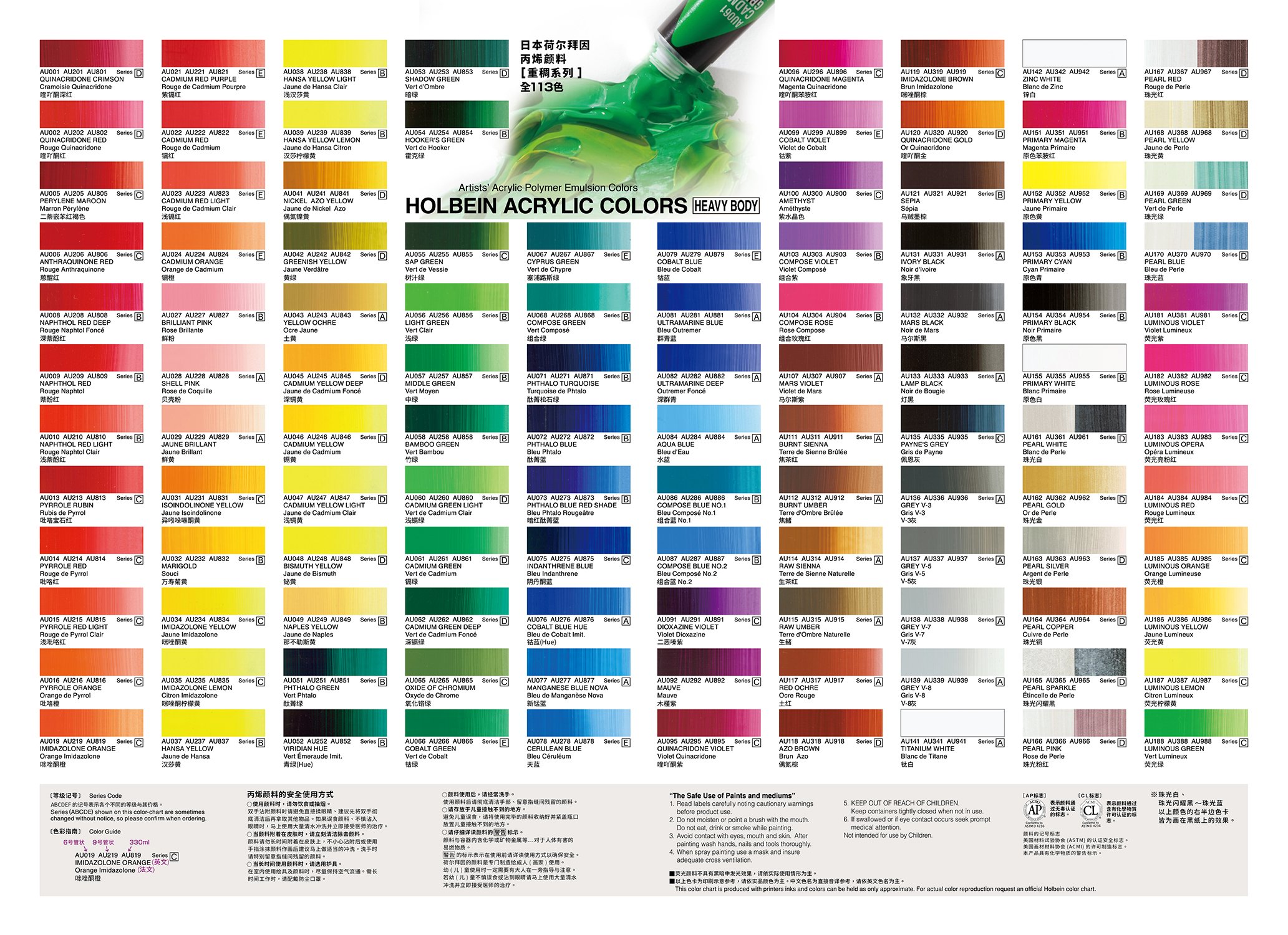 • 重稠、流质、液态系列这三种丙烯,色彩相同,浓稠度各异但彩度、明度与耐光性相通,可交替使用。