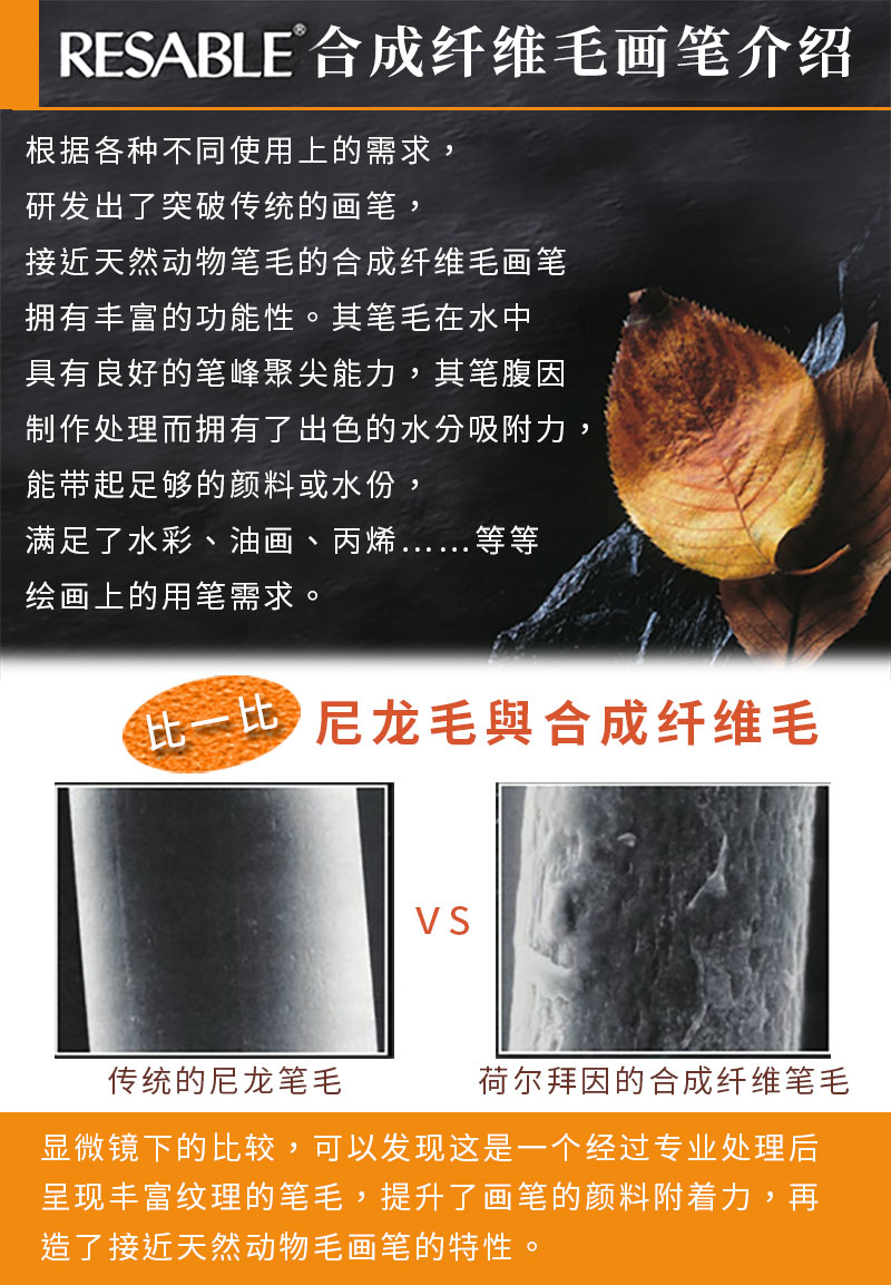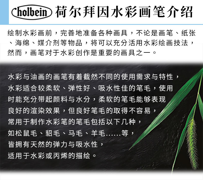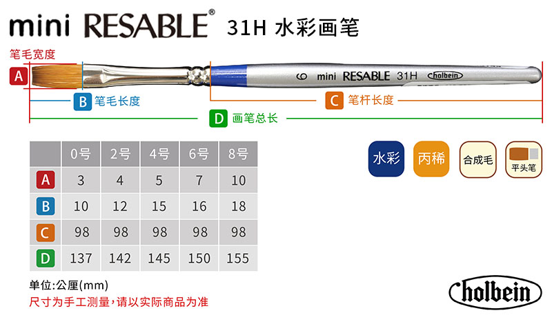 - 笔毛采用挑选过的合成纤维毛,含水性佳、有弹性,使色彩鲜艳、笔触鲜活,适合用来绘制水彩画、丙烯画。