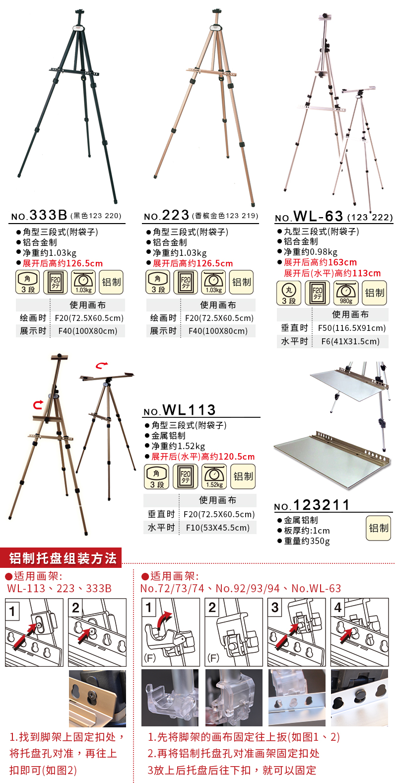 - 稳固的三脚基座不易倾倒,铝制画架质量轻巧使用耐久。