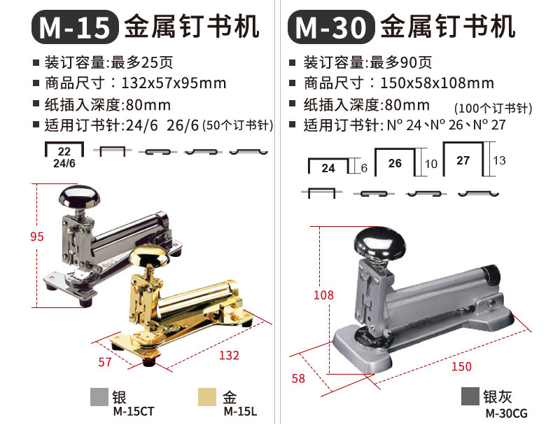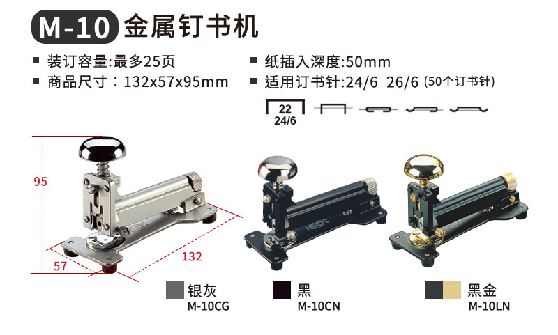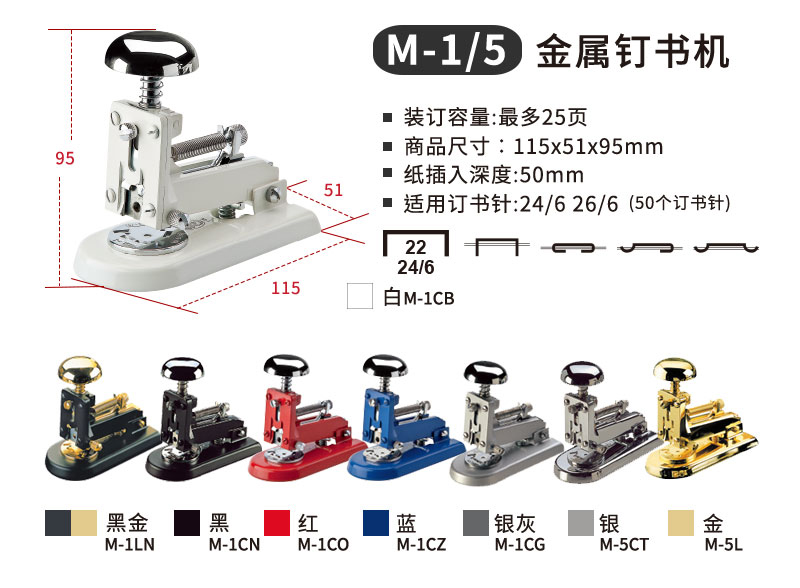 - 品牌专利的M-5型号钉书机,特别的造型外观蕴含着精密的结构,加上选用23K金以及黑铜的材质搭配,发散出不同于一般的时尚品味。