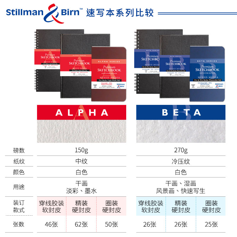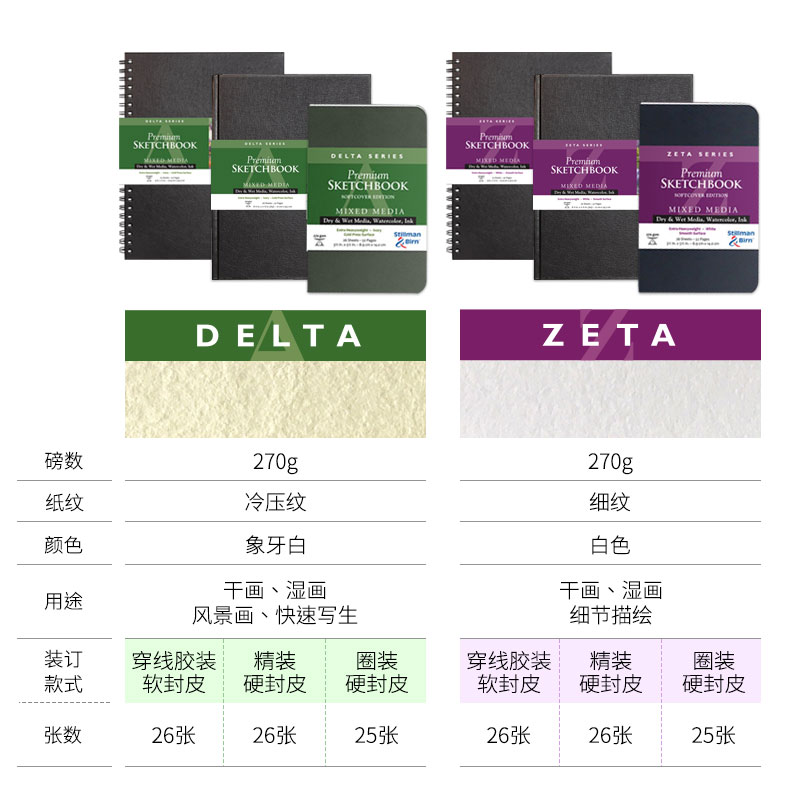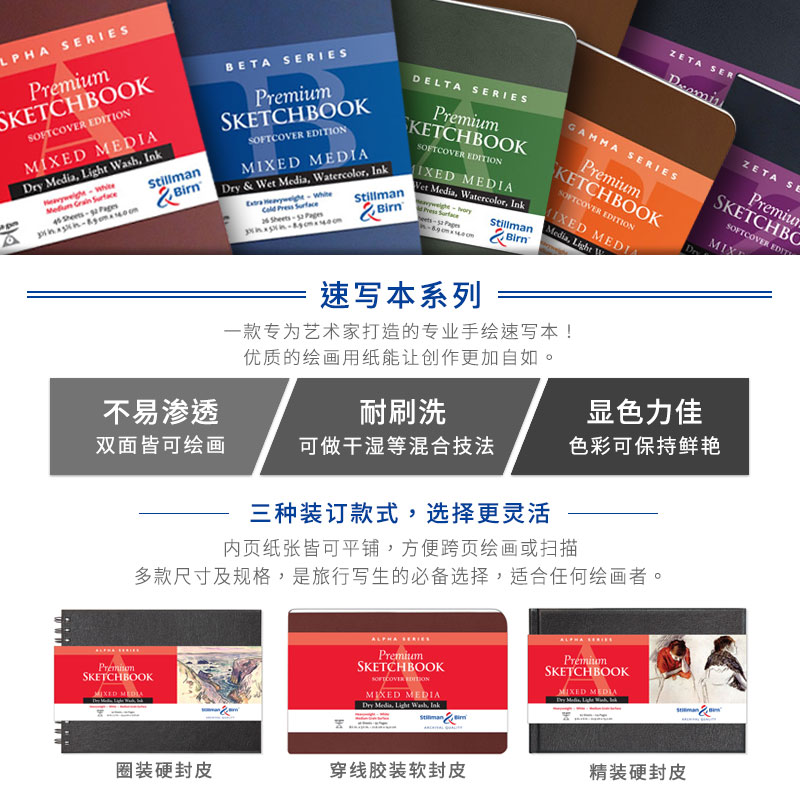 - 经典软封皮:穿线胶装加上仿皮革封面,两边采用圆角设计,可防止边缘磨损,绘画时轻松翻页,使用灵活、耐用。