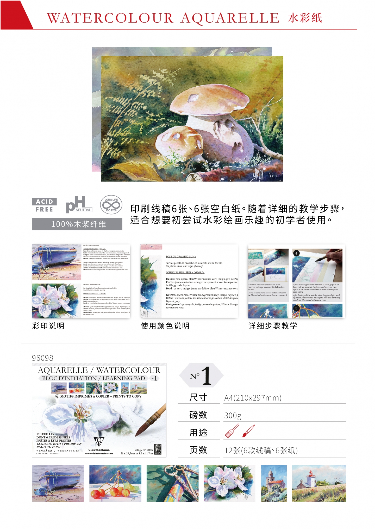 商品说明: 纸张厚实坚韧,吸水性佳不易起皱,显色效果较好。 不含化学增光剂,不会因反光而令人感到刺眼。 内有彩色详细绘画教学步骤,可以跟着一步一步画,适合水彩绘画的初学者使用。 此系列有四款(N1花卉、N2马卡龙、N3马款(方型)、N4马款)可选择,每款皆有六张线稿及六张空白水彩纸可使用。