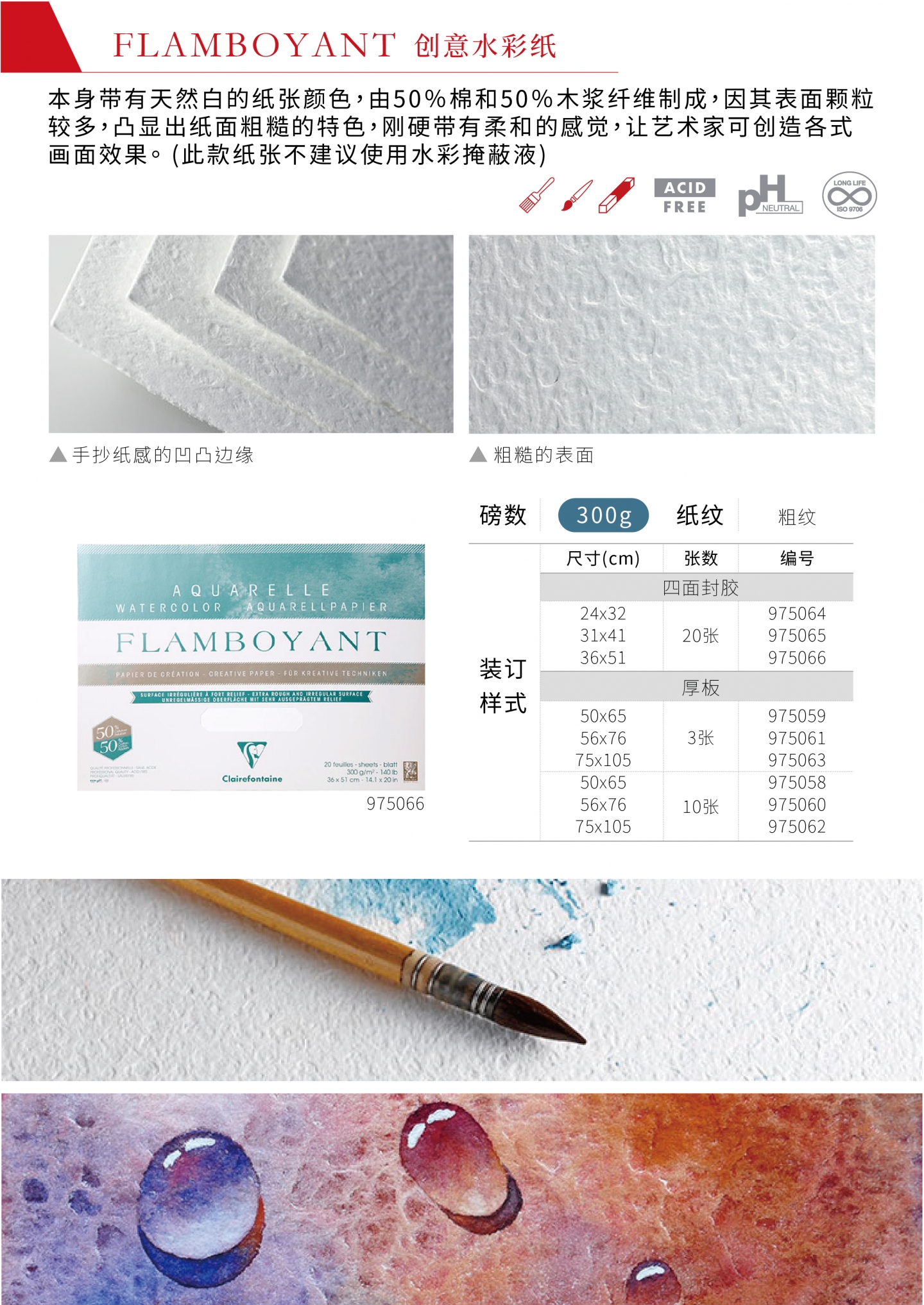 商品说明: 本身带有天然白的纸张颜色,由50%棉和50%纤维制成。 因其表面颗粒较多,凸显出纸面粗糙的特色,刚柔却有柔和的感觉,让艺术家可创造各式画面效果。 四边安全封胶,防止运送过程纸张折损。 ※此款纸张不建议使用水彩掩蔽液。